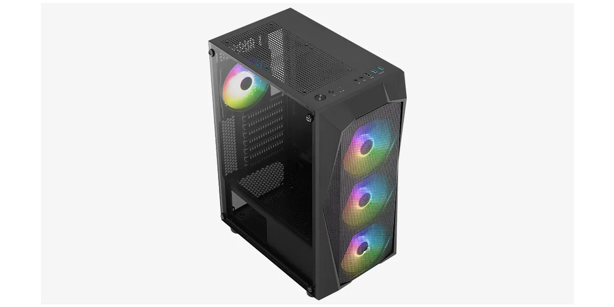 De Gaming behuizing combineert stijl en functionaliteit. De subtiele RGB-verlichting en het transparante zijpaneel geven de desktop een moderne uitstraling, terwijl de goede ventilatie en stille 620W voeding zorgen voor stabiele prestaties en een stille werking – ook tijdens langere sessies.